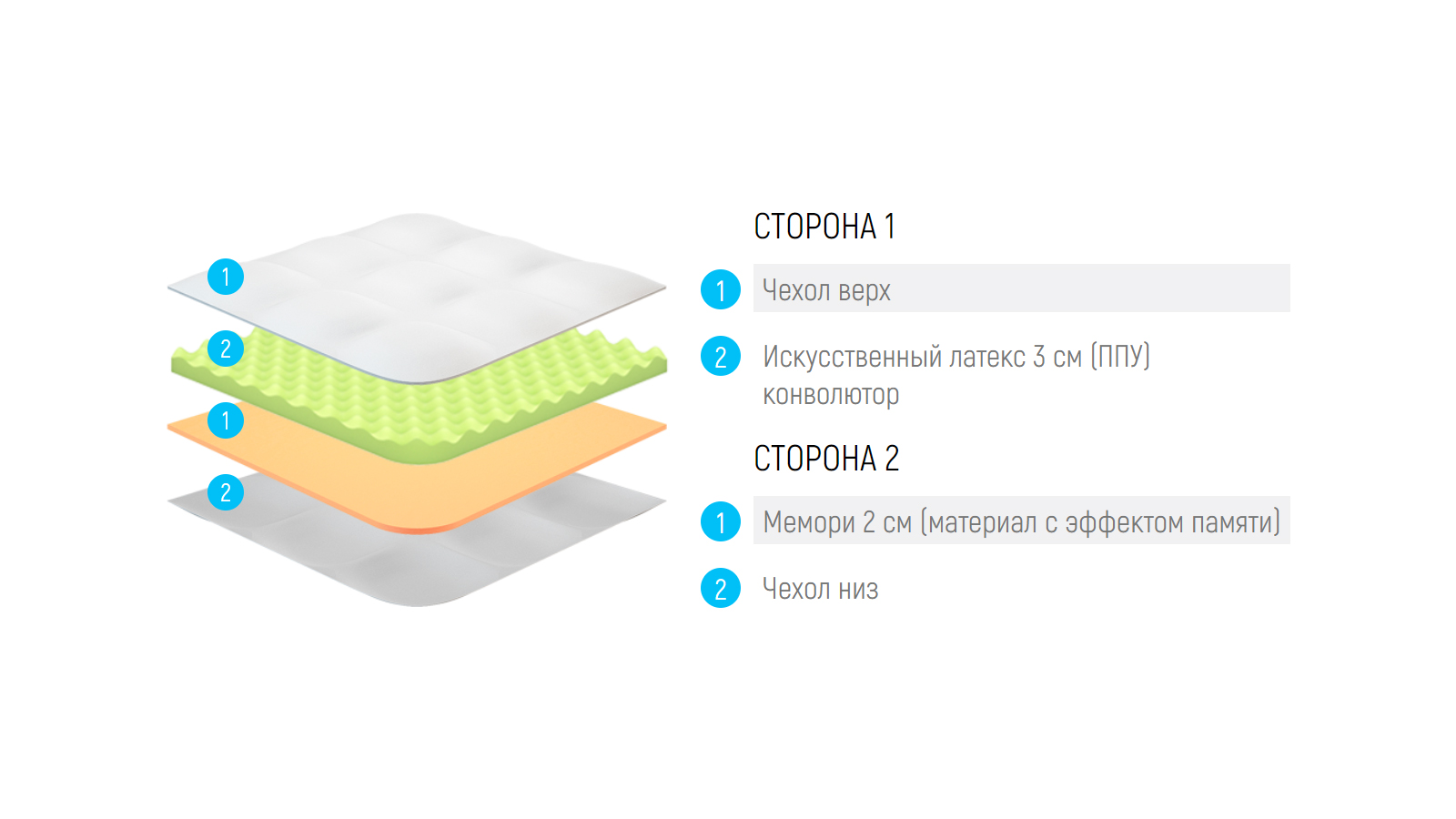 В наматраснике "Memory" используется искусственный экологически чистый материал Memory Foam. Материал специальной структуры, подстраивающийся под форму тела. Memory Foam - изобретение космической программы NASA для снижения нагрузки космонавтов. Наматрасник обладает отличными анатомическими свойствами.